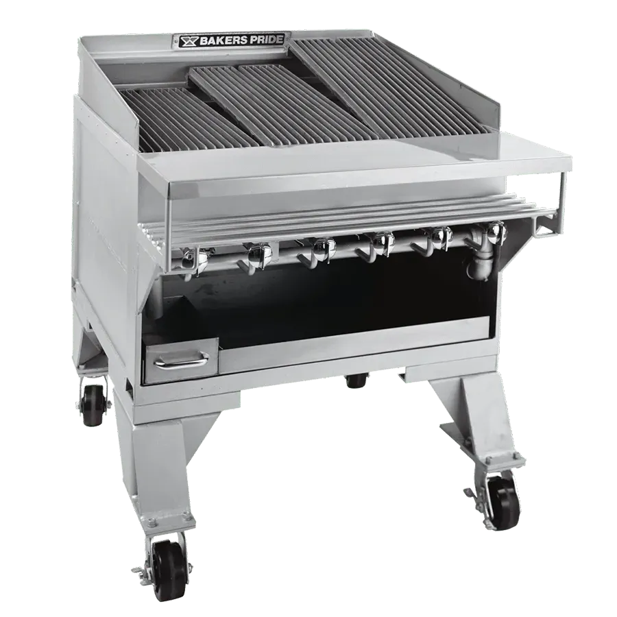 The Bakers PrideĀ® model CH-6 charbroiler is the perfect choice for high-volume broiling. It is constructed of extra heavy-duty plate steel for durability, and each of the six burners has an output of 18,000 BTUH for energy efficiency yet high production. This model features cast-iron top grates, but you can also select other grate types such as floating rods and meat grates at no extra charge. Grates may be adjusted in three separate titling positions for increased flexibility and temperature control. Heavy-duty, stainless steel radiants come standard or can be substituted for cast iron. For even more versatility, choose from a wide variety of options, such as Glo-Stones and log holders for added flavor or casters for mobility. This charbroiler can also be built in with stone, brick, or masonry for exhibition kitchens.