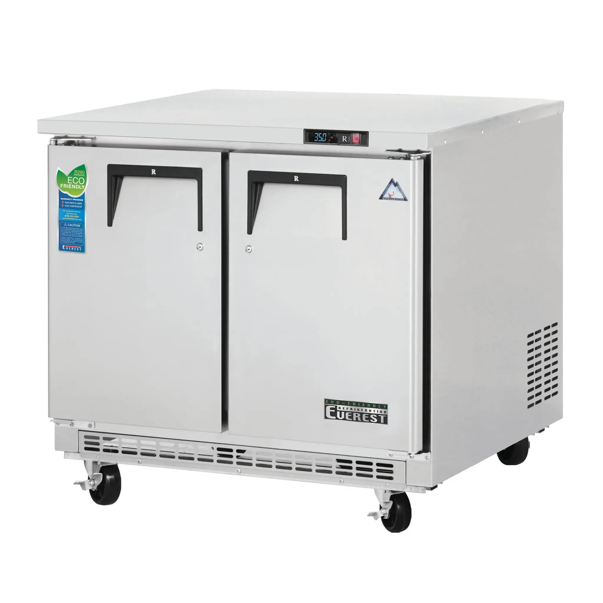 Culinary artistry redefined with Everest Refrigeration, ETBSR2, Refrigerator, Undercounter, Reach-In. This two-section undercounter/worktop refrigerator is a game-changer for commercial restaurants. With a spacious 10.0 cu. ft. capacity, it provides ample storage for all your ingredients. The self-contained rear mounted refrigeration ensures efficient cooling, while the 16 gauge stainless steel worktop offers a durable and hygienic surface for food preparation. The two solid hinged self-closing doors, equipped with locks, keep your ingredients secure. Inside, you'll find four epoxy coated wire shelves with height adjustable clips, allowing you to customize the storage space to suit your needs. The digital controls with LED display make it easy to monitor and adjust the temperature, while the auto defrost feature saves you time and effort. With its front air breathing and pressure relief port, this refrigerator ensures optimal performance in any kitchen layout. The stainless steel interior, front, and sides, along with the galvanized steel bottom and rear, guarantee long-lasting durability. Using R290 Hydrocarbon refrigerant, this unit is energy-efficient and environmentally friendly. Trust Everest Refrigeration to elevate your culinary experience.