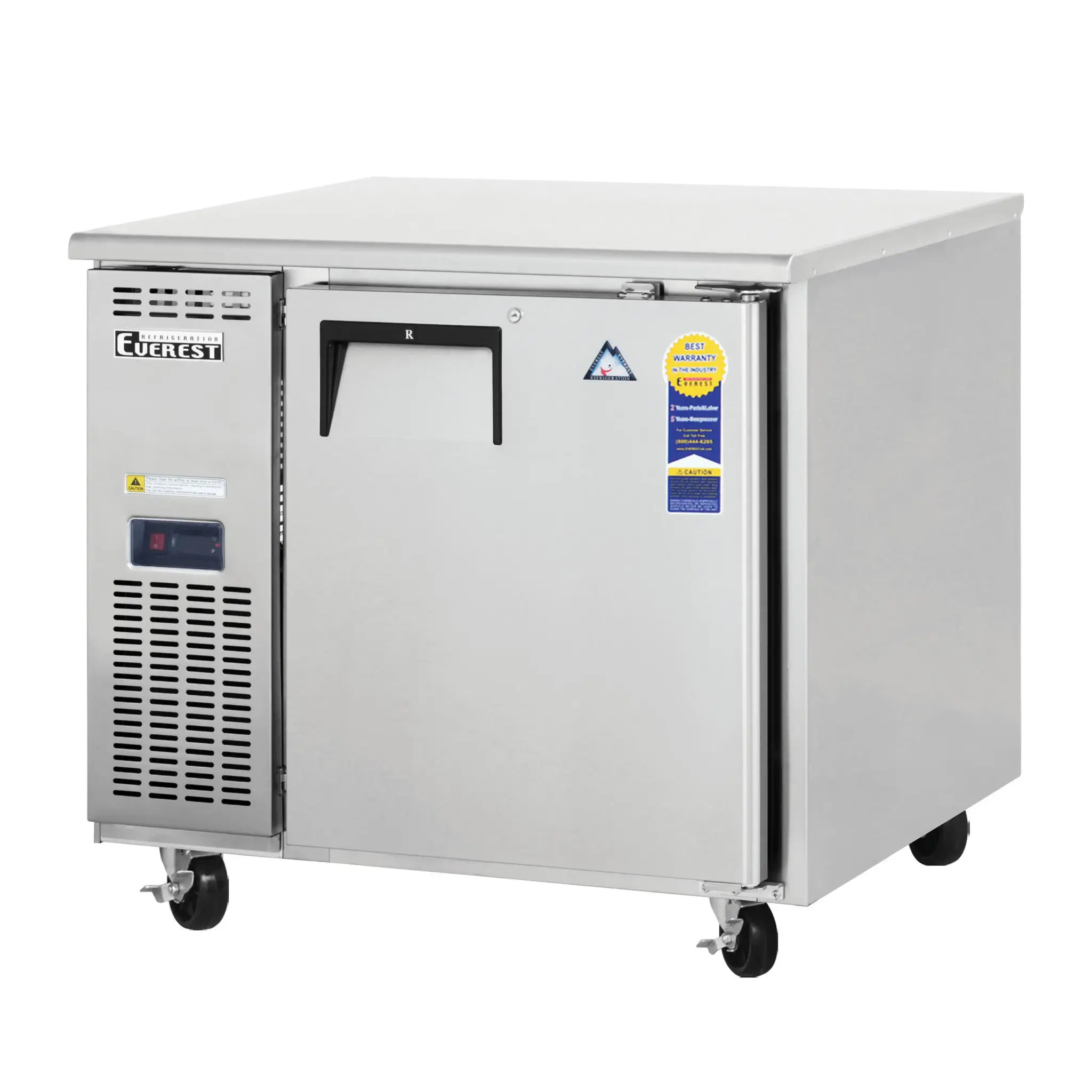 Introducing the Everest Refrigeration ETF1 Freezer, Undercounter, Reach-In - the perfect solution to simplify restaurant operations. With its sleek design and compact size, this undercounter/worktop freezer is ideal for commercial restaurant use. The one-section unit offers a generous 9.0 cu. ft. capacity, providing ample storage space for your frozen goods. The self-contained side mounted refrigeration system ensures efficient cooling, while the 16 gauge stainless steel worktop offers durability and easy cleaning. The solid hinged self-closing door, equipped with a locking mechanism and door frame heater, guarantees secure storage and prevents frost build-up. The digital controls with LED display allow for precise temperature adjustments, ranging from -10F to 54F, ensuring optimal food preservation. The LED interior lighting illuminates the contents, making it easy to locate items. With features like auto defrost, overheat protection alarm, and pressure relief port, this freezer is designed to meet the demands of a busy commercial kitchen. The Everest Refrigeration ETF1 Freezer is NSF and ETL-Sanitation certified, guaranteeing its safety and reliability. Upgrade your restaurant's storage capabilities with this high-quality undercounter freezer.